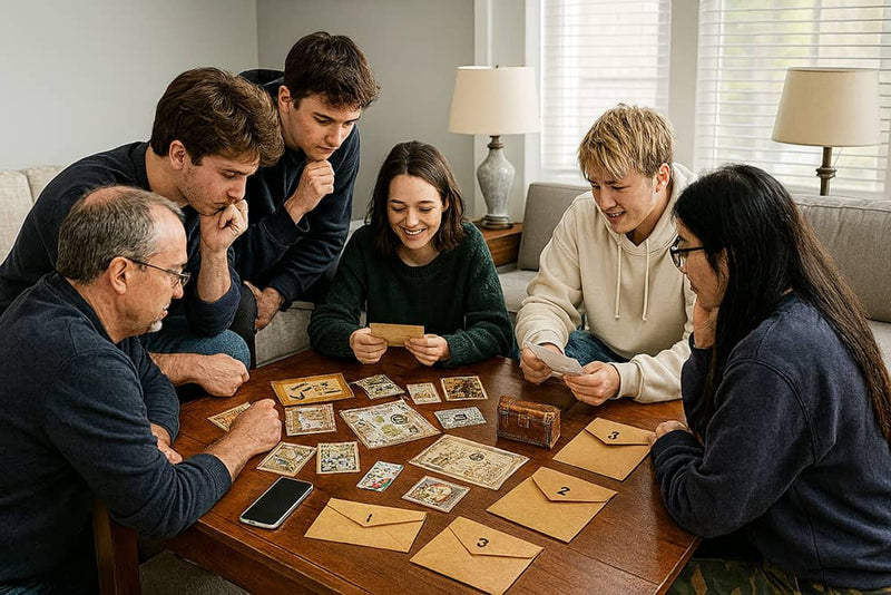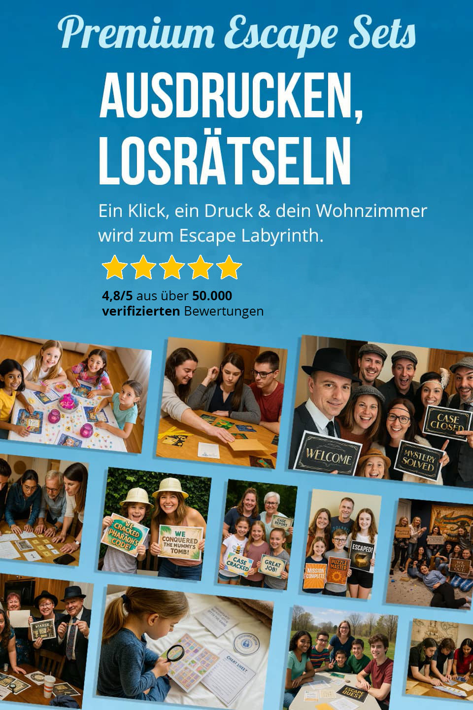 Unsere Sets funktionieren ab 1 bis 12 Spielern. Empfohlenes Mindestalter ist 10 Jahre; mit etwas Hilfe haben aber schon Achtjährige Spaß. Durch die Hinweisekarten passt sich der Schwierigkeitsgrad flexibel an gemischte Gruppen an.